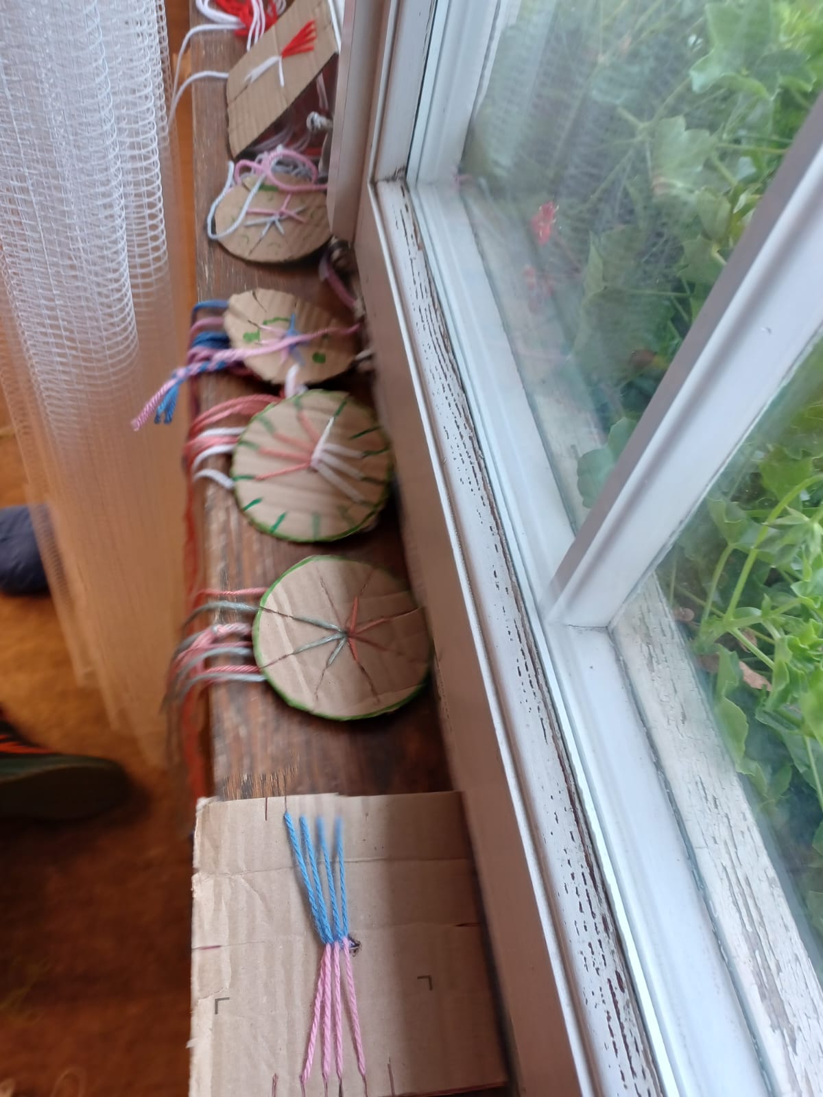 Den Kindern machte es so viel Spaß, dass kurzerhand eine zweite Scheibe entworfen, neue Fäden zugeschnitten und erneut eingespannt wurden.